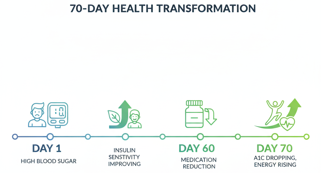 | Initial Response | Weeks 1-2 | Blood sugar begins stabilizing, energy improves, initial weight loss (5-10 lbs) |